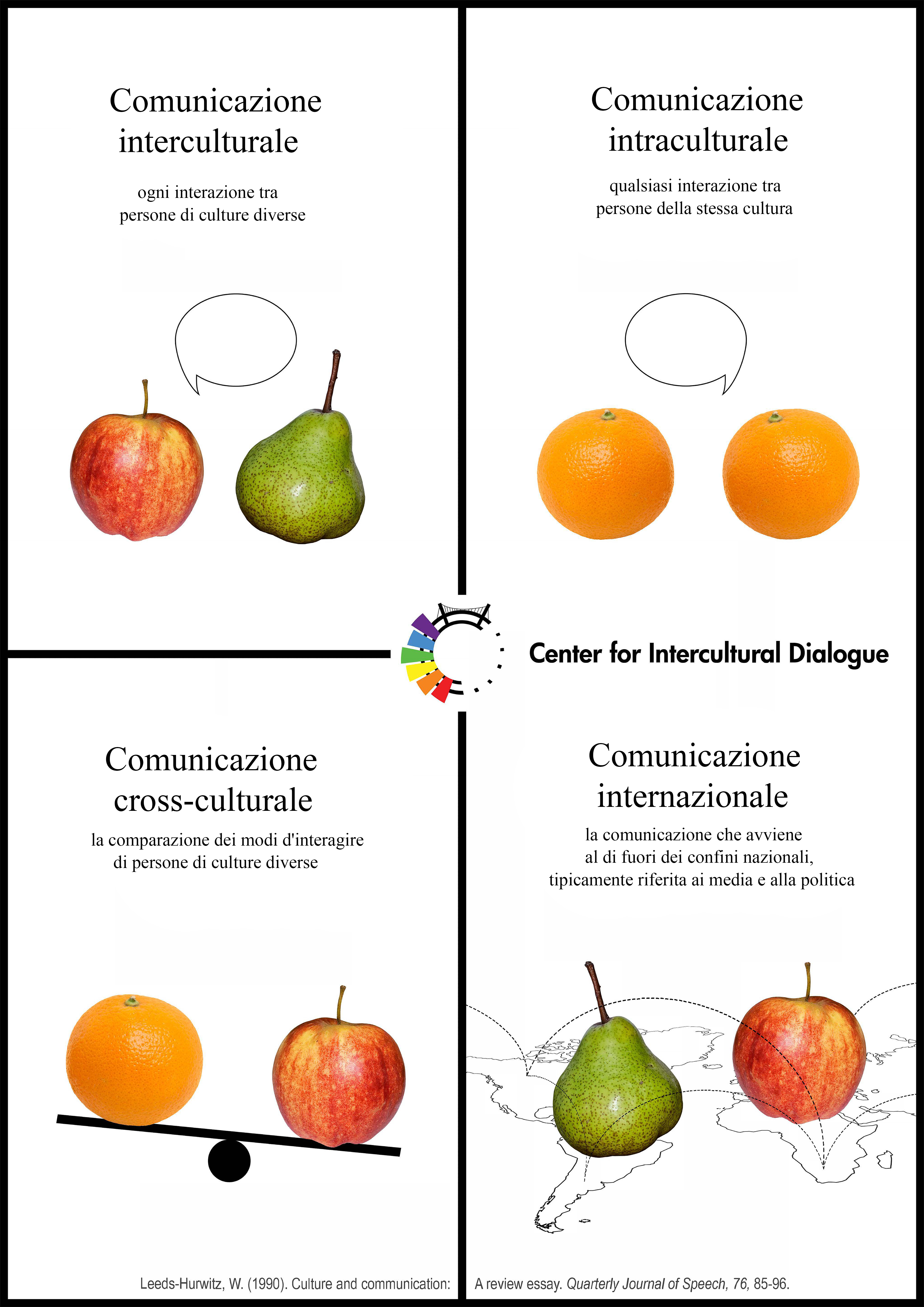 This poster was designed by Linda J. de Wit, and published previously; it now has been translated into Italian. This one clarifies the differences between intercultural, intracultural, cross-cultural, and international communication.