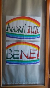 In these new and solitary days, in our creative country [Italy], a spontaneous proposal was born. It was soon shared among the people and became viral (in every sense!): find a way to encourage the others, with messages posted on the windows and the balconies. The sentence proposed was: “Andrà tutto bene,” or “Everything is going to be fine.” The idea was to write on white sheets, drawing the rainbow. It was soon made by children and families. I thought to draw it on paper and I posted the design on my window facing the road.