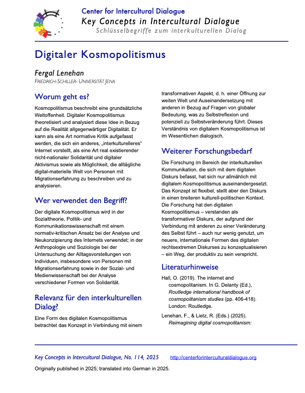 Lenehan, F. (2025). Digitaler Kosmopolitismus. Key Concepts in Intercultural Dialogue, 114. Available from: https://centerforinterculturaldialogue.org/wp-content/uploads/2025/04/kc114-digital-cosmopolitanism_german-.pdf